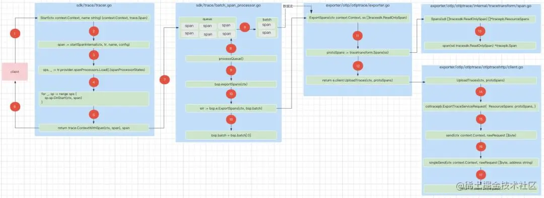 根据配置的所有 span 的 processors,使用每一个 processor 的 OnStart 的去处理 span,这里的 OnStart 其实是空实现。不管是 simple 类型的,还是 batch 类型的,目前都是一个是个空的方法,这个方法的定义的作用就是在开始处理 span 的时候,做一些处理。最后返回一个初始化后的 span 给到客户 (注意,要想让这个 span 真正的进入到整个 trace 里,还要调用 span 对象的 End 方)。