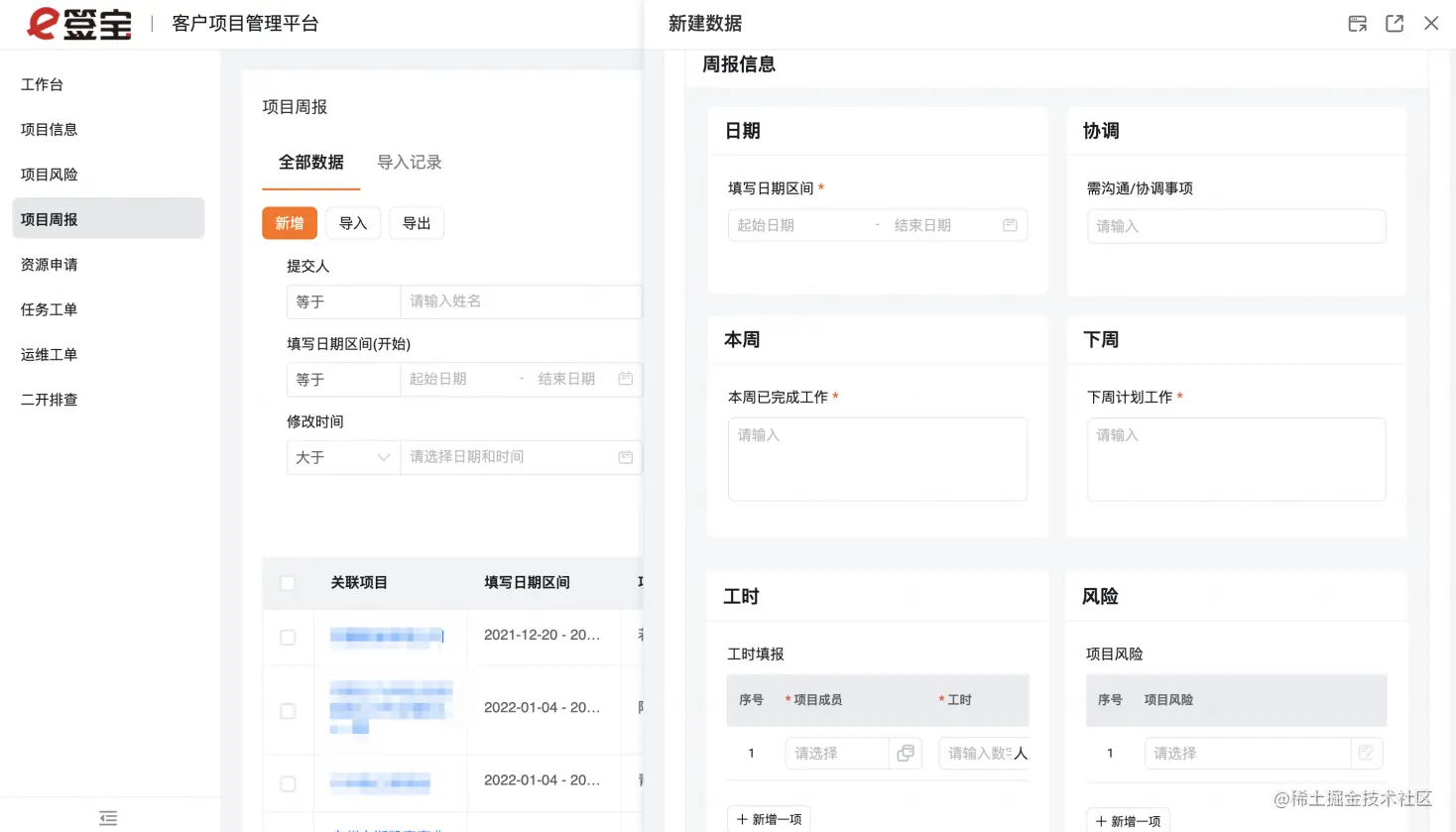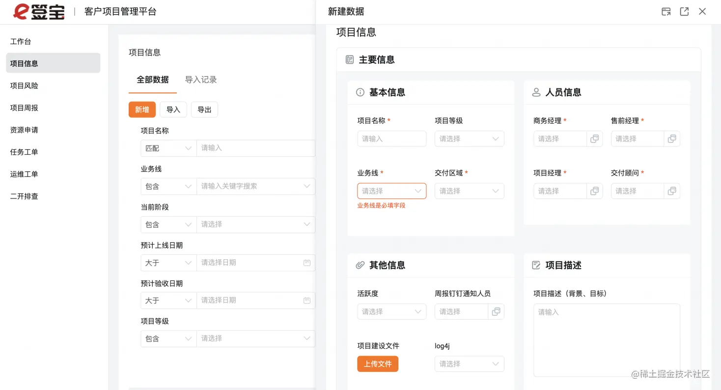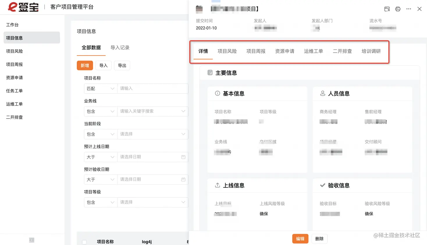 **客户项目管理平台:**包含了项目的基础信息记录、项目的跟进情况以及项目需要的资源记录和工单任务等模块。通过项目实时提交汇总,使得各个项目节点的任务一目了然。以项目信息提交为例:项目经理可以针对客户项目分别进行信息补充,对客户反馈的现场信息进行实时流转,同时在线持续推动项目进度,提升了沟通效率。