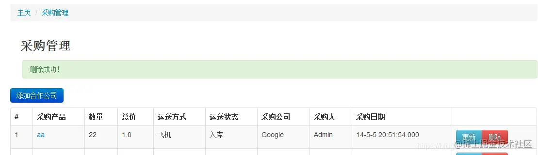 成功删除采购信息后会在页面上给出绿色的成功提示信息。