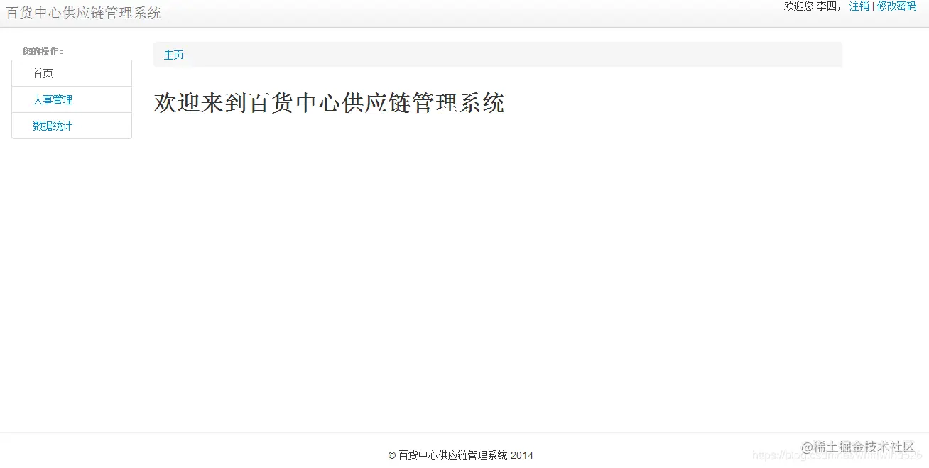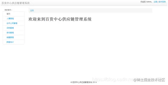 成功登录的用户会进入系统欢迎界面,整个界面是借助Tiles的帮助完成的,它让系统可以在执行不同的请求后只让页面的主题部分跳转,而网页的头、导航栏、尾部不跳转,节省了大量重复书写代码带来的开销。