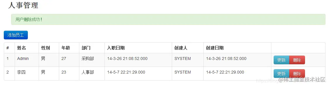 成功删除员工信息后会在页面上给出绿色的成功提示信息。