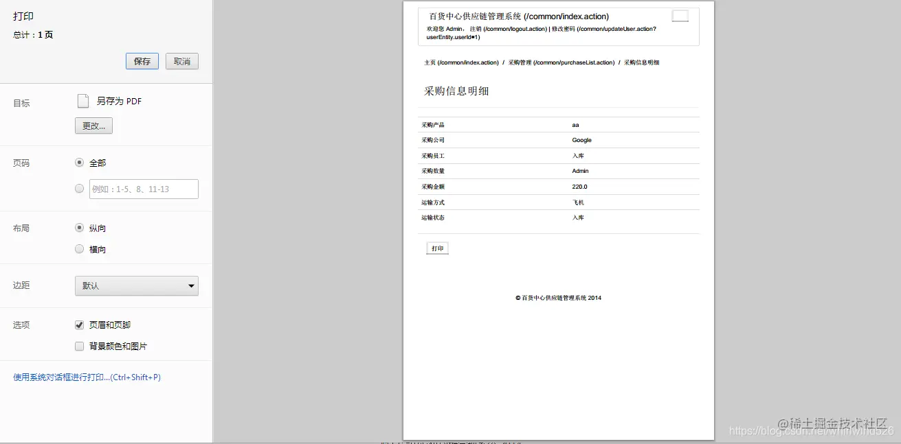 在采购信息明细界面下方点击“打印”按钮,进入打印采购信息明细界面,可以将相应的采购订单详细信息保存或打印。
