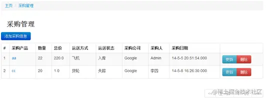 用户进入采购管理界面后,可以根据页面的文字提示对采购信息进行相应的操作,所有采购订单的主要信息被页面上的表格列出并实现分页功能。