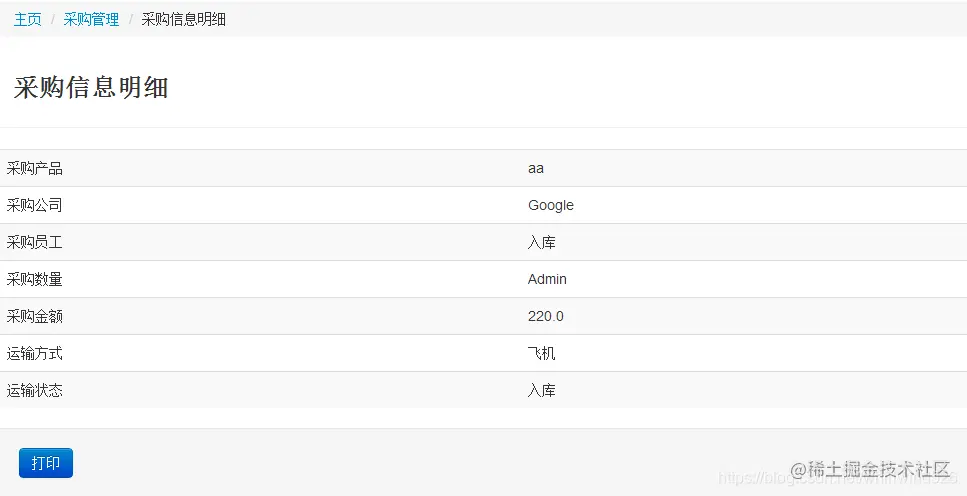 在采购管理界面点击单个的采购信息链接,可以进入采购信息明细界面,在本页面中可以看到本采购订单的详细信息。