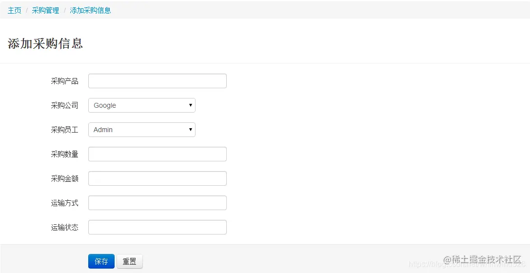 用户点击采购管理界面上的“添加采购信息”按钮进入添加采购信息界面,在本页面中输入要添加的采购信息后,点击保存,即可将新的采购信息添加进数据库中,如果有关键的信息没有正确输入,页面会给出相应的提示。