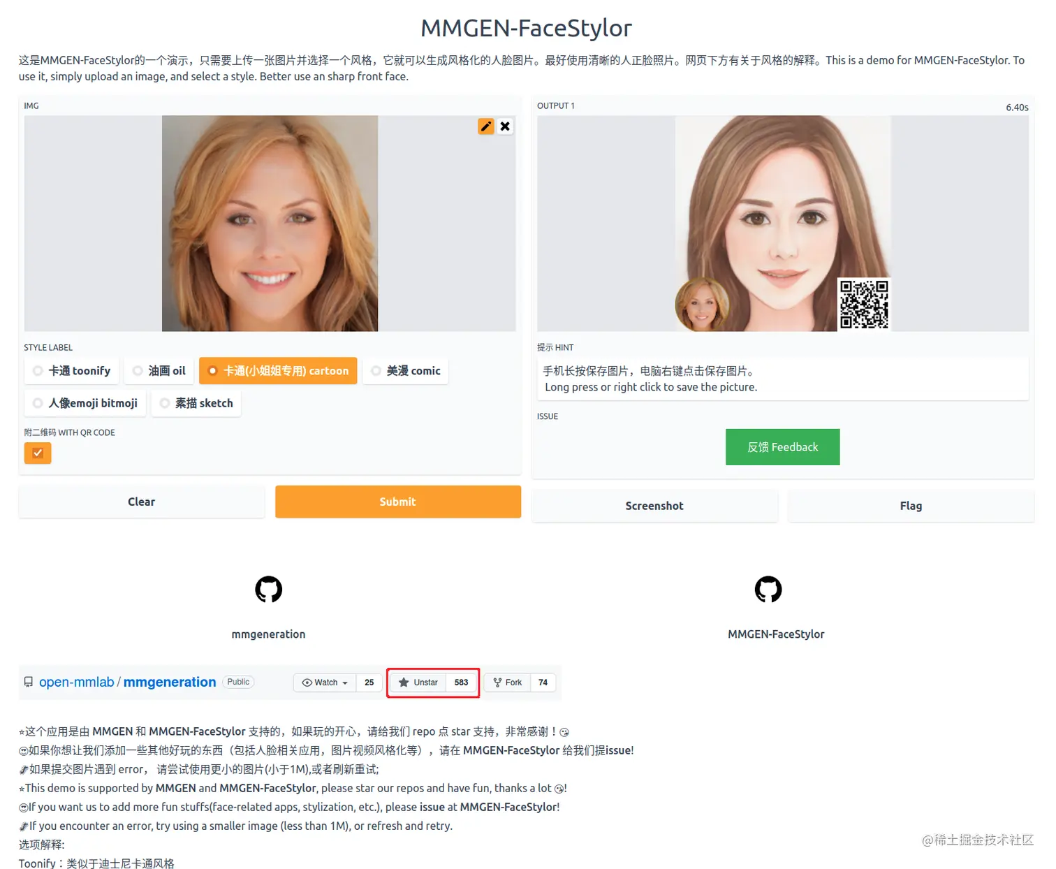 下面是我们团队算法同学利用 gradio 写的 MMGEN-Facestylor,换头像神器,