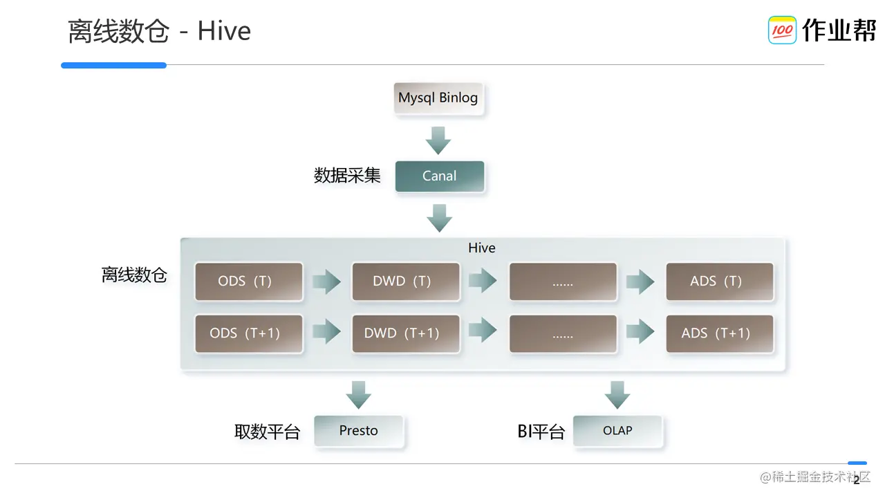 作业帮离线数仓基于 Hive 提供从 ODS 层到 ADS 层的数据构建能力,当 ADS 表生成后,会通过数据集成写入 OLAP 系统面向管理人员提供 BI 服务;此外,DWD、DWS、ADS 表,也会面向分析师提供线下的数据探查以及取数服务。