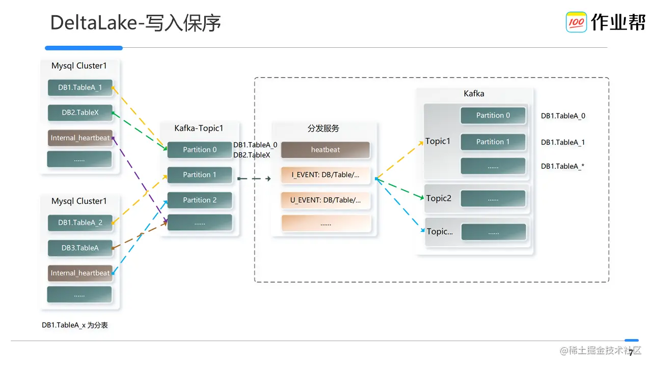 - 保障分库分表,甚至不同分表在不同集群的情况下,数据写入到 Kafka 后的有序性。即写入 DeltaLake 的 Spark 从某个 topic 读取到逻辑表的数据是 partition 粒度有序的。
