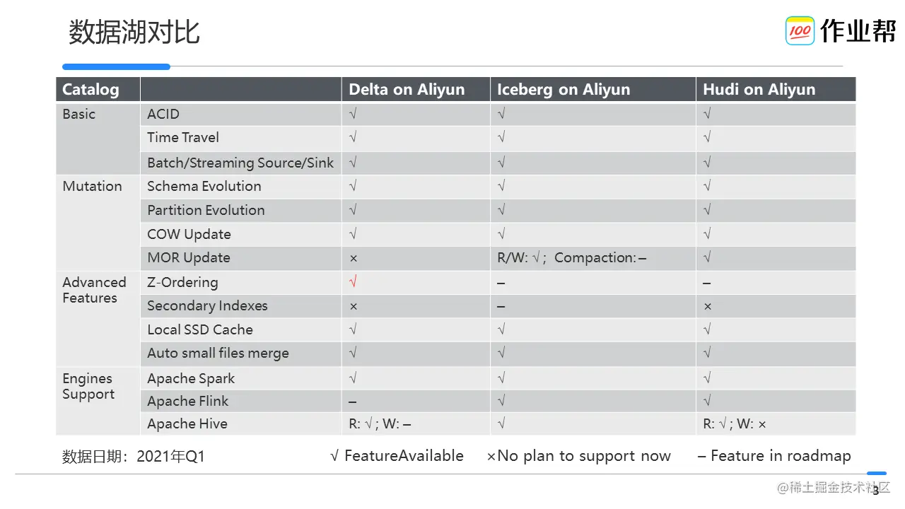目前数据湖方案主要有 DeltaLake、Iceberg、Hudi。 我们调研了阿里云上这三种方案,其区别和特点如下: