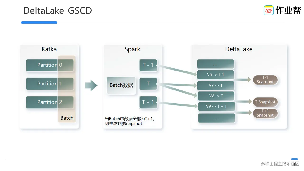 - 当 Spark 读取某一个 batch 数据后,根据上述表元数据使用数据中的 event time 生成对应的 dt 值,如数据流中 event time 的值均属于T+1,则会触发生成数据版本T的 snapshot,数据读取时根据 snapshot 找到对应的数据版本信息进行读取。