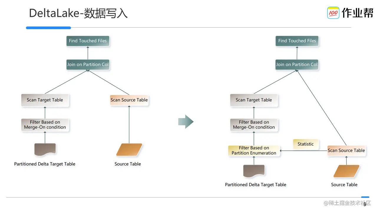 针对这种场景,对 DeltaLake 做了升级:使用 DPP 做分区剪枝来优化 Megre into 的性能,如上右图所示: