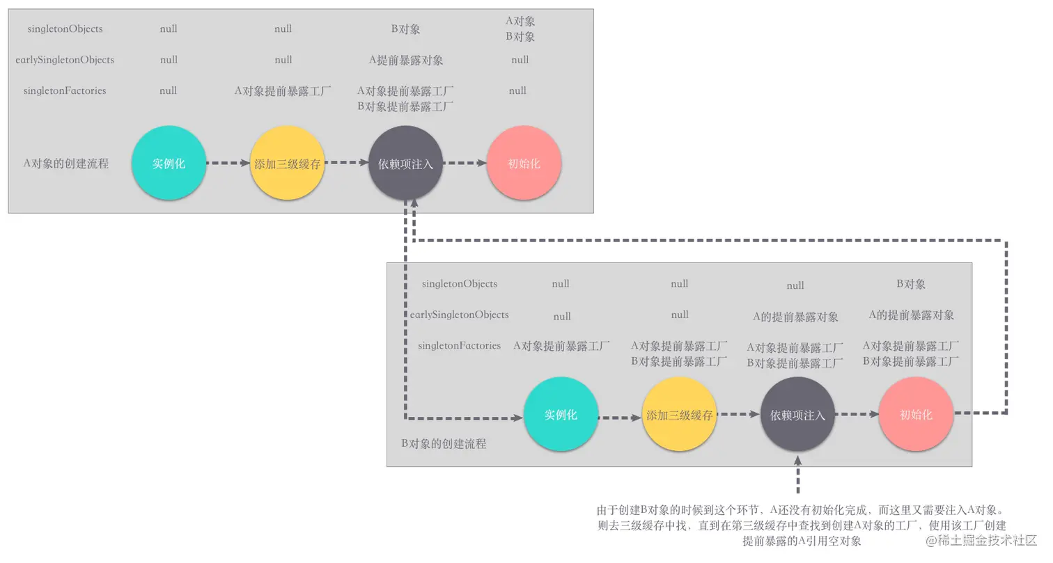 简单通过文字描述下整个流程(当然了三级缓存中的一级缓存中的创建完成的bean不止这两个对象,还包含spring内置的一些对象):