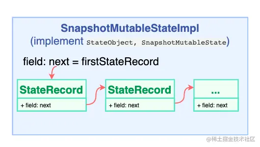 再次套娃🪆,StateObject 本身又是一个容器,以链表的形式存储着一串 StateRecord ⬅️ 这个真正保存了数据。为什么是一串?因为它不仅保存了变量的最新值,还保留了曾经的值,以便实现「撤销」等功能。既然是链表,那肯定存在第一个节点,就是 StateObject.firstStateRecord ,后继节点就是 StateRecord.next。注意这个 next 和 SnapshotMutableStateImpl.next 无关,恰好重名而已。事实上 SnapshotMutableStateImpl 里有一个链表保存着所有值(实现了 StateObject 接口呀),它的首个节点是 SnapshotMutableStateImpl.next。SnapshotMutableState