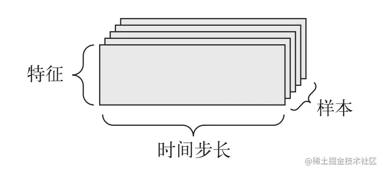 当数据集中时间(或序列顺序)对于数据很重要时,应该将数据存储在带有时间轴的 3D 张量中。 每个样本可以被编码为一个向量序列(即 2D 张量),而一个数据批量就是一个 3D 张量。