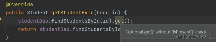 // correct way to do it@Overridepublic Student getStudentDirectly(Long id) { final var studentOptional = studentDao.findStudentsById(id); if(studentOptional.isPresent()){ // do your stuff here }}