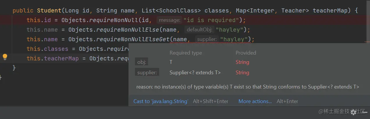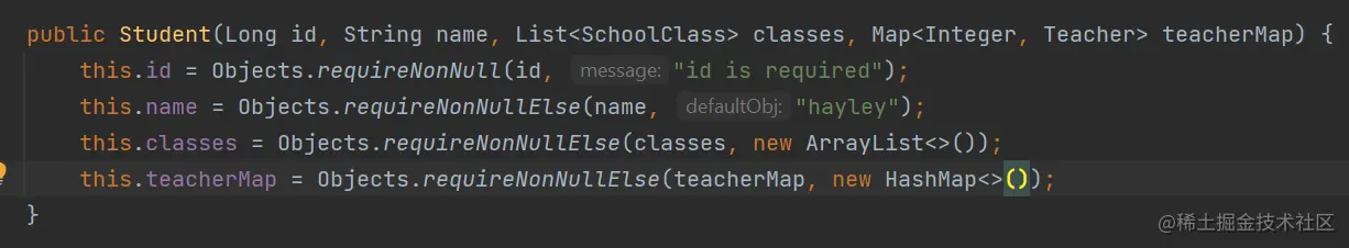 requireNonNullElse on name :我们在说 "这个字段是必须的,所以如果它是空的,不要抛出一个异常,而是为它设置一个默认值。"在我们的例子中,默认值是 "hayley"。