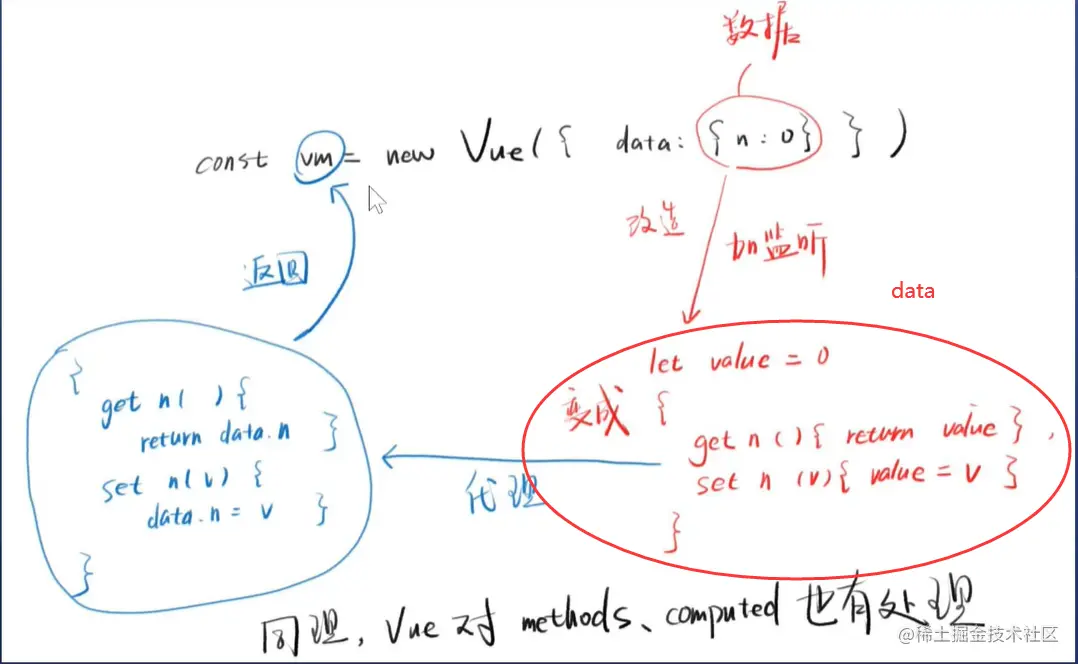 const vm = new Vue({data:{n:0}})- 我如果修改 vm.n,那么 UI中的 n 就会响应我