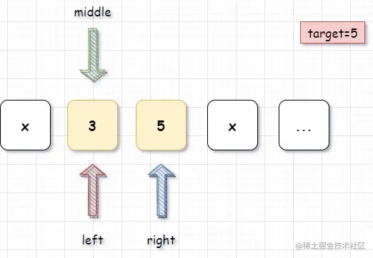 此时查找的元素在 2 个元素的右边,而当且仅有 2 个元素时,middle 必然是在两者的左边(对于 middle = left + (right - left) / 2 而言)。