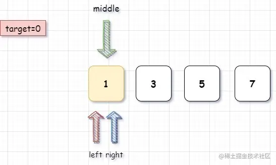 如下图,当查找值🔍为 0 时(显然数组中不存在),当处于如下的状态准备进入下一轮循环时(还未找到 0),此时 left 和 right 都与 middle 相等,且假设进入循环的条件为 left <= right,符合!所以继续循环,middle 赋值后还是和 left、right 相等,改变 right 状态(right = middle)无法缩小搜索范围,所以这轮循环后,三者恒成立,从而进入了死循环!
