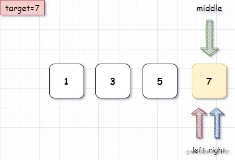 如下图,当查找值🔍为 7 时,准备下一次判断前 left 和 right 都与 middle 相等,此时进入下一轮循环(索引值为 3 的元素未查找)继续查找 7,若循环判断条件为 left < right,那就会退出循环,直接返回 -1(未找到)。