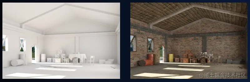第二个能力是平面材质的生成。图形学中的表观(Appearance)又称材质,是描述光线如何在物体表面和内部进行交互的一种性质,由材质模型和一组控制参数来定义表面外观。从下组图可以看出,左边的图,如果不仔细看,对整个场景的感受非常弱,但如果把墙面、地面、油桶、桌面,这些材料加上去以后,真实感立刻显示出来了。