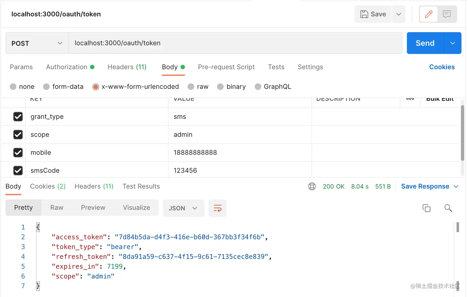 以上代码中,就是将 Spring Security OAuth 内置的四种授权模式的 Granter 添加到一个列表中,再将我们刚才创建的 SmsTokenGranter 添加进去,最后在封装成一个 CompositeTokenGranter 并配置到 endpoints 中。