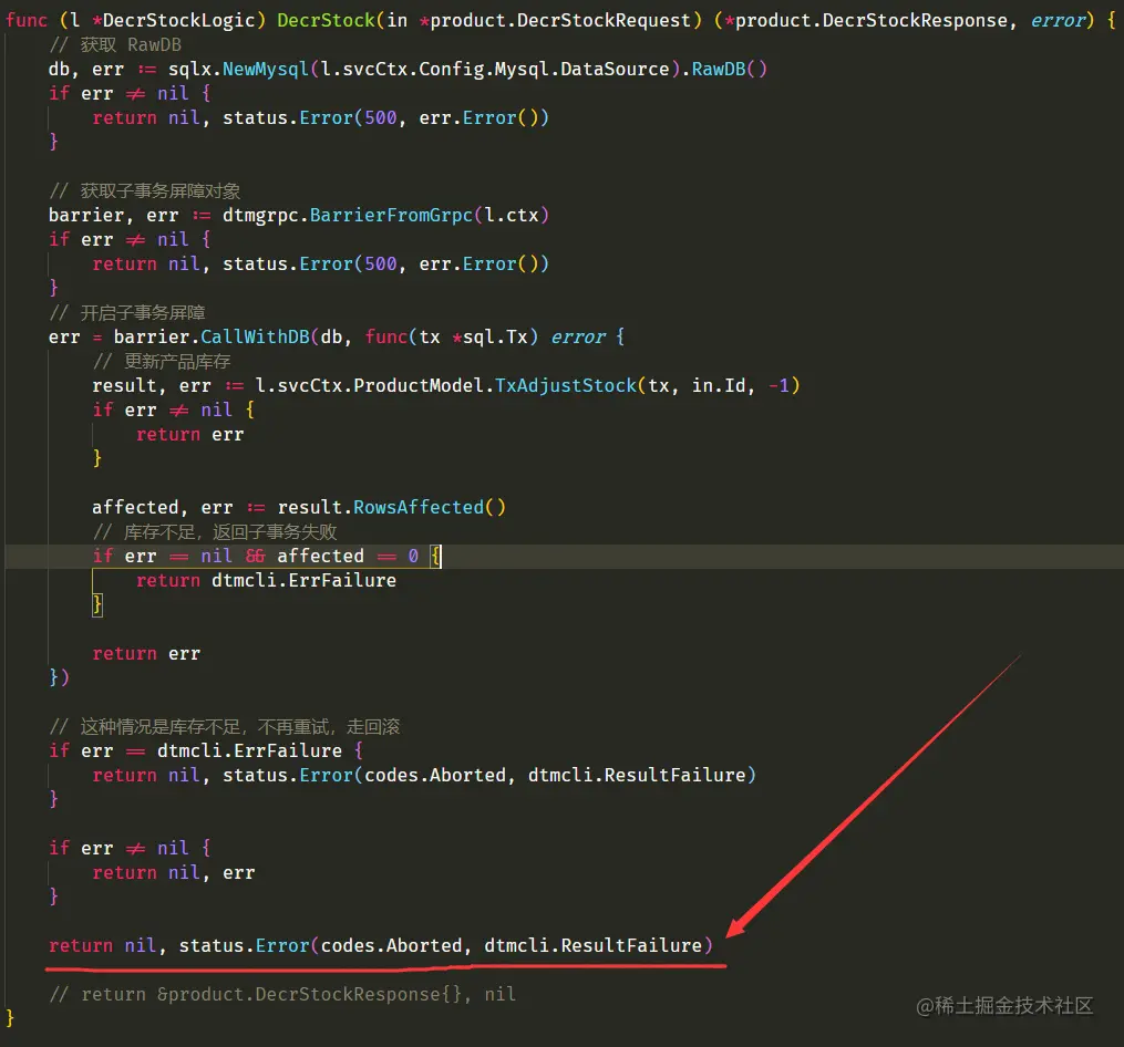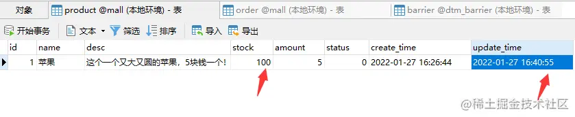 1库存修改为100,然后在product rpcDecrStock接口方法中子事务屏障外,人为的制造异常失败。