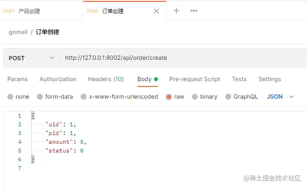 postman调用/api/order/create接口,再创建一个订单,产品IDpid为1。