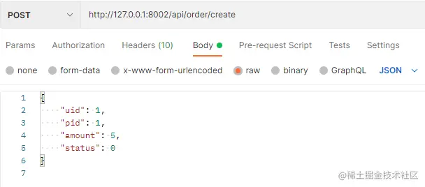 postman调用/api/order/create接口,创建一个订单,产品IDpid为1。