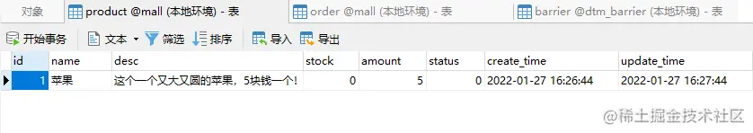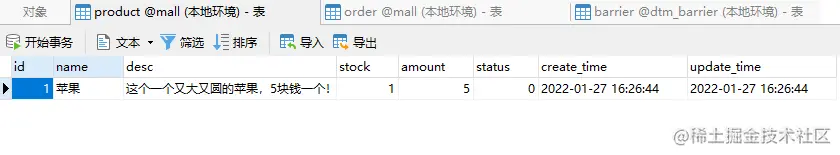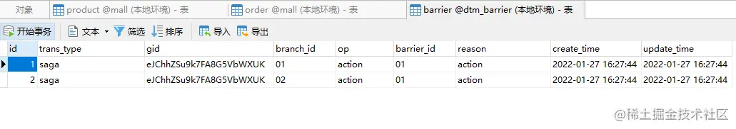 barrier里的数据,我们可以看出(gid = ZbjYHv2jNra7RMwyWjB5Lc)第一个服务(branch_id = 01)子事务屏障操作是正常,第二个服务(branch_id = 02)子事务屏障操作也是正常。因为在product rpcDecrStock接口方法中子事务屏障外,我们人为的制造异常失败,所以两个服务发生了补偿的操作记录。