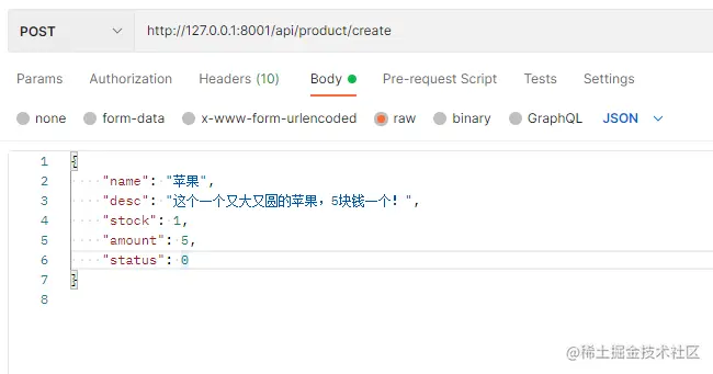postman调用/api/product/create接口,创建一个产品,库存stock为1。