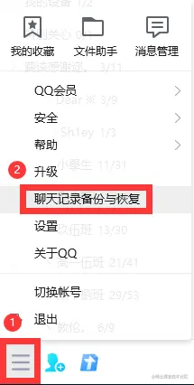 步骤一: 登录电脑版QQ,点击左下角的三条横线的图案,再点击“聊天记录备份与恢复”。