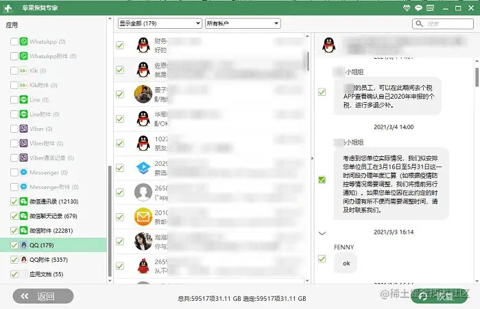步骤三: 勾选需要恢复的聊天记录,最后后点击“恢复”。