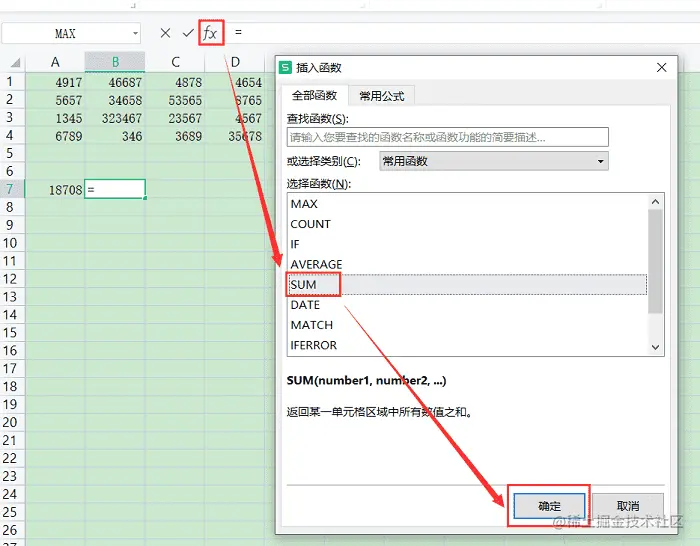 步骤三: 如果不想打字的话,点击空白单元格后,再点击“fx”,在“常用函数”这个类别里找出“SUM”,点击“确定”;