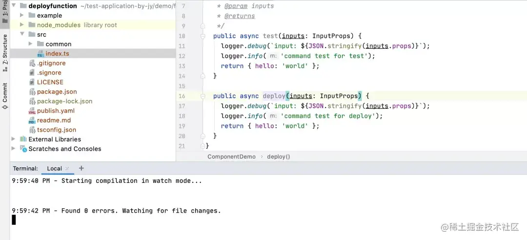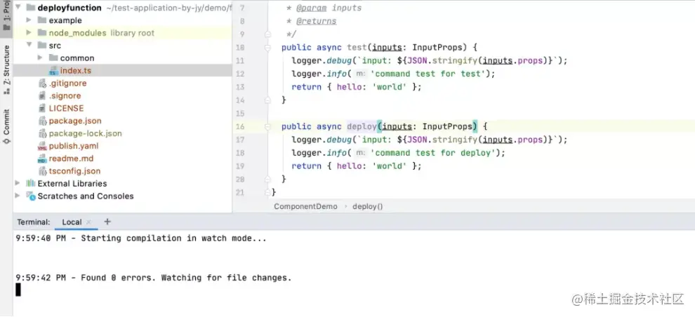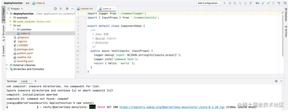 此时,可以通过 IDE 打开当前项目,并通过npm进行依赖安装(因为 Serverless Devs 是基于 Typescript 的项目,所以组件的开发仅支持 Typescript 和 Node.js 语言):
