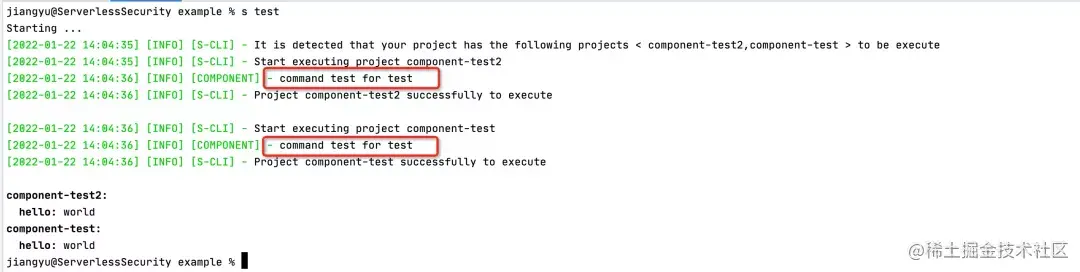 此时 test 方法会打印日志信息等,并返回最终的结果给命令行工具:{ "hello": "world" }