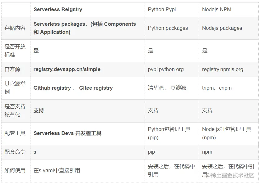 在说什么是 Serverless Devs Packages 之前,需要先说一下 **Serverless Registry,**相信很多研发同学都是知道,不同语言/生态都有自己的包管理平台,例如 Python 语言的 Pypi,Node.js 的 NPM。