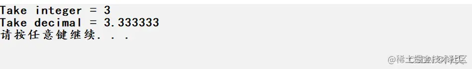 #define _CRT_SECURE_NO_WARNINGS 1 #include <stdio.h> int main(void) { int a = 10; int a1 = 10; int b = 3; float b1 = 3.0; int c = a / b; float c1 = a / b1; printf("Take integer = %d\n", c); printf("Take decimal = %lf\n",c1); return 0; }