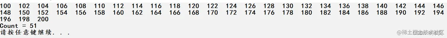 取模运算符练习:算出 100~200 当中能被 2 除以的数字打印出来,并且用 count 计次打印出来的总数。代码示例显示如下: