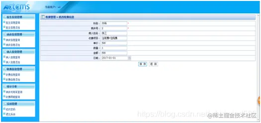 进入收费信息管理后,可以查看病人的科别、病床号、病人姓名、收费项目、单价、数量、金额和日期,还可以通过对病人姓名的搜索,来对信息进行查询,也可以对收费信息进行添加、修改和删除。