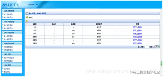 进入病床信息管理后,可以查看病床的科别、病床号、床位费和使用状态,还可以对病床的信息进行添加、修改和删除。