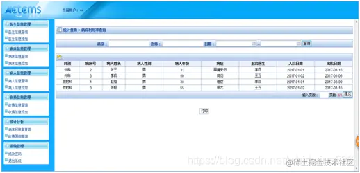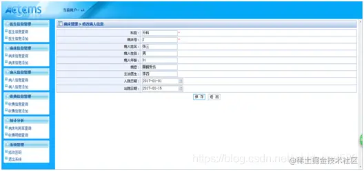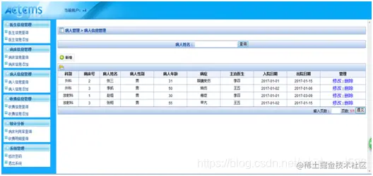 进入病人信息管理后,可以查看病人的科别、病床号、病人姓名、病人年龄、病症、主治医生、入院日期和出院日期,还可以通过对病人姓名的搜索来查看病人的信息,也可以对病人的信息进行添加修改和删除。