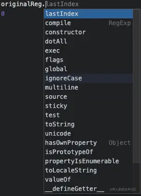 originalReg,其值为/789/g,是一种表达文本模式(即字符串结构),有点像字符串的模板。但是通过.来访问其属性,发现该属性类型存在很多内部属性