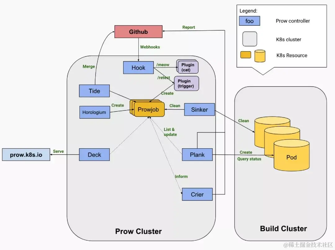 在 GitHub 上写好代码,提交 PR 就会触发一些 job,比如单元测试、静态检查等,全部通过以后才能提 PR。 从图上可以看到,中间黄色那一块叫 Prowjob,这个部分可以自己定义。Hook 模块会不断解析设置的一些 Hook,然后就会触发一些 Plugin,都是开发者自己定义的一些事情,比如 Code Review 时,打一个/LGTM 也就是 Look Good To Me,意味着这一环节通过。