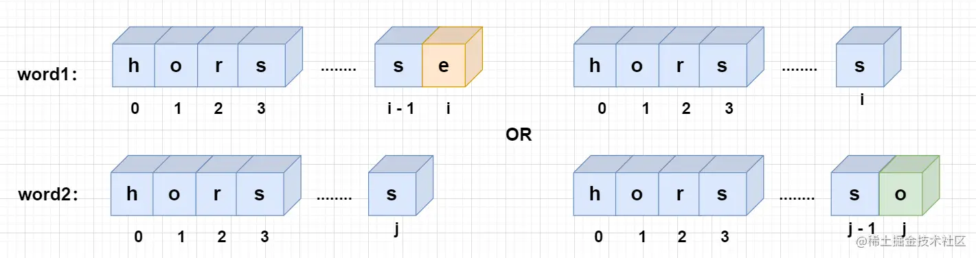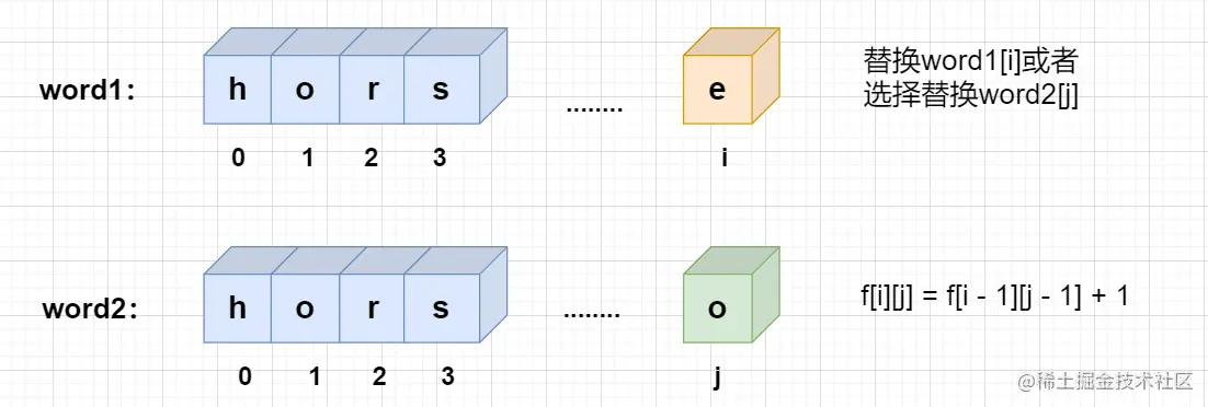 word1的第i个字符或者替换word2的第j个字符,当前位置的字符不匹配,进行替换操作后两者变得相同。