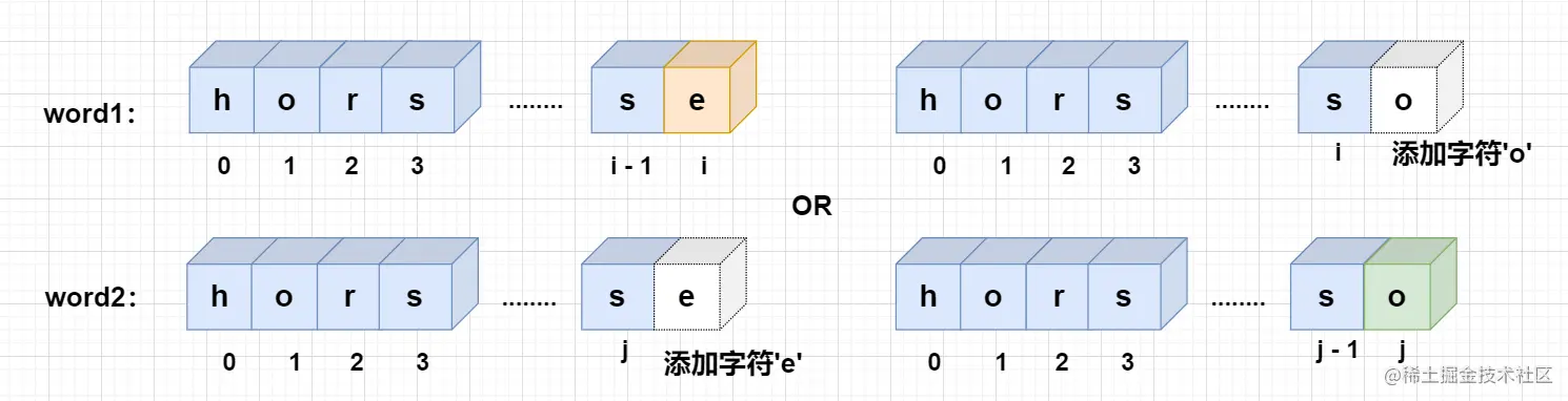 word1[0 ~ i-1]与word2[0 ~ j]匹配或者word1[0 ~ i]与word2[0 ~ j-1]匹配,除了考虑删除多余的字符操作以外,我们还可以执行添加操作,因此添加和删除的状态计算其实是一样的。所以