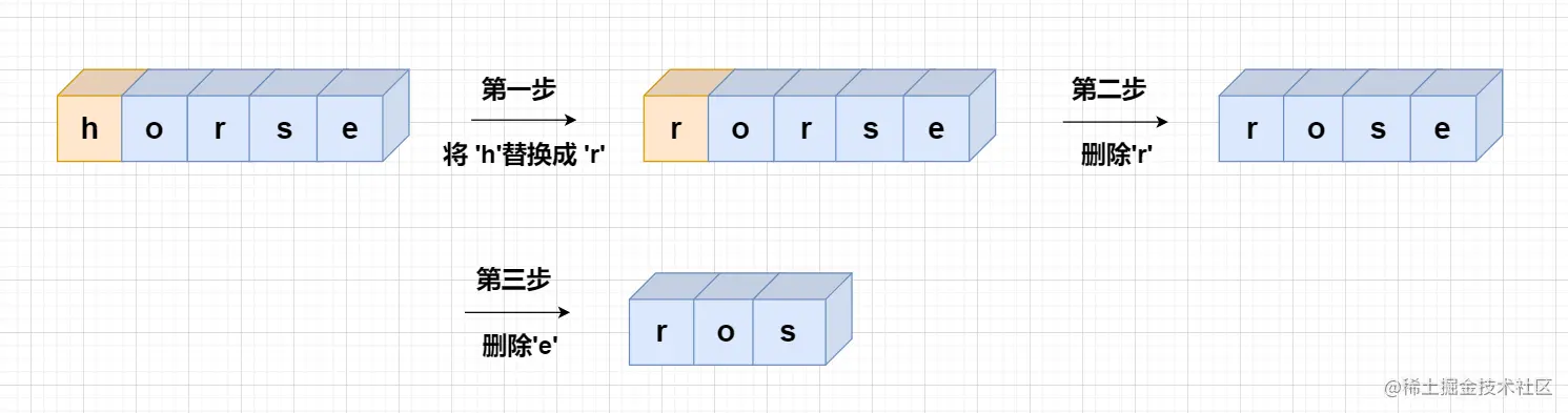 如样例所示,word1 = "horse", word2 = "ros",我们将word1转换成word2所使用的最少操作数为3,下面来讲解动态规划的做法。