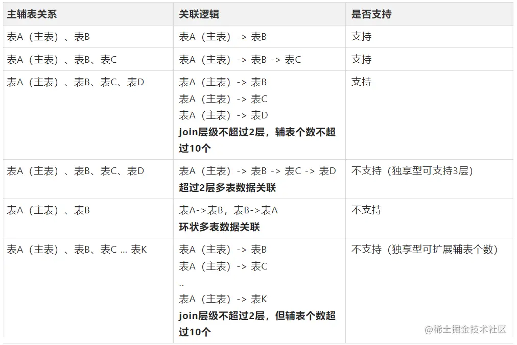 接入开放搜索前,需要预先设计好表结构(可单表,可多表join),以便后期应对各种搜索业务场景和数据推送场景。目前开放搜索支持的多表场景如下: