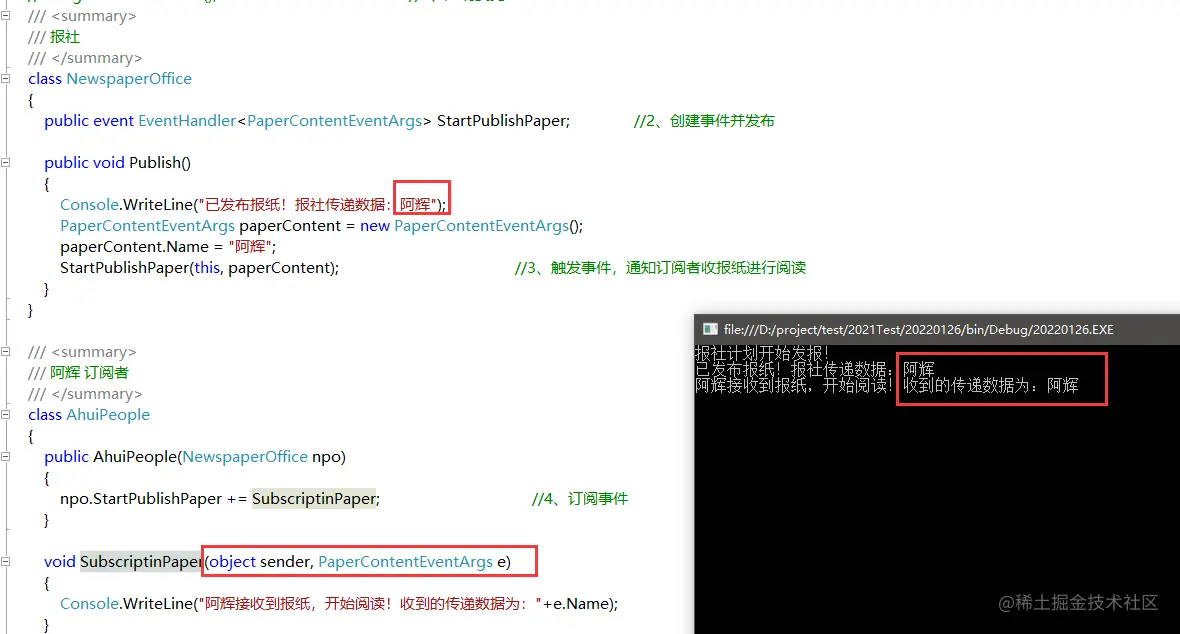 Console.WriteLine("阿辉接收到报纸,开始阅读!收到的传递数据为:"+e.Name);