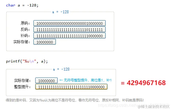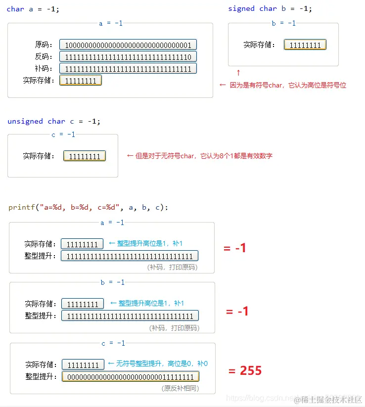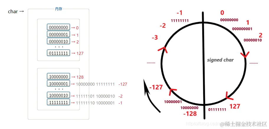 ② 但是,char 比较特殊!char 到底是 signed char 还是 unsigned char,C语言标准 并没有规定,取决于编译器,大部分编译器 char 指的都是 signed char 。